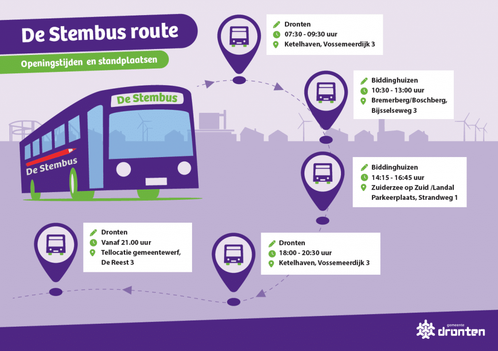 Ook dit jaar hebben we De Stembus route! Een mobiele stembus die door Dronten en Biddinghuizen rijdt zodat écht iedereen kan stemmen.